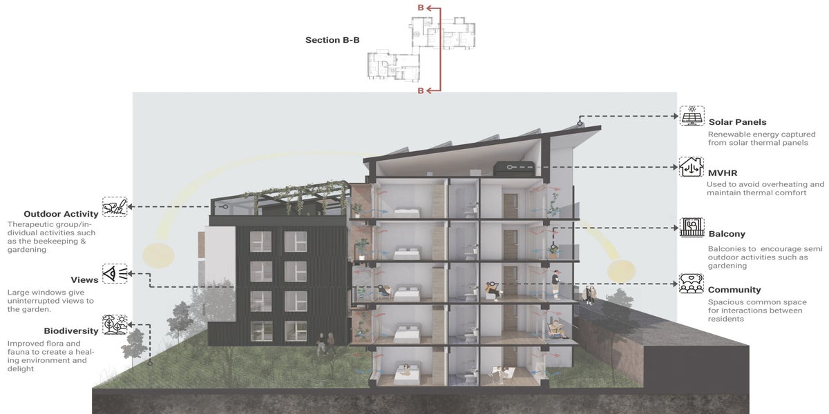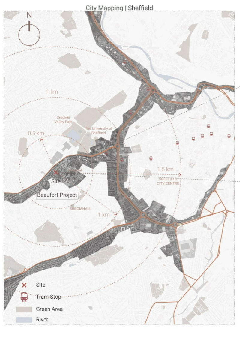 The Beaufort Project is located in Sheffield, near the University of Sheffield. The site consists of two buildings, each with three primary entrances on the north façades, as well as an additional entrance on the west side providing access to the back garden.