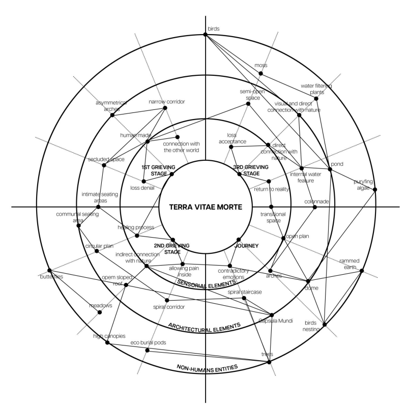 Terra Vitae Morte constitutes an experimental and contemplative milieu wherein patrons undergo diverse stages and typologies of grief. Anchored in the fundamental principles of Loss and Rebirth, integral to the edifice’s ethos, visitors are prompted to reflect upon and recollect their bereavements within distinct areas, or sanctuaries, each deliberately exposed to various natural and architectural elements. The overarching objective of our undertaking resides in the architectural design of a structure intended to shepherd individuals through the emotional terrain of losing loved ones, fostering an acceptance of death as an inherent, cyclical phase within the broader journey of life.