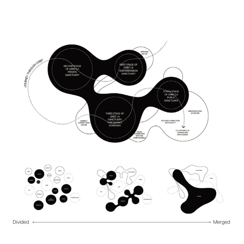 The diagram illustrates the initial stages of conceptualising the architectural design. It begins by depicting the current layout of the site, where humans and non-humans are segregated into separate areas, with minimal interaction between them, facilitating the exploration of potential connections. Ultimately, our proposal advocates for an inclusive design that is able to accommodate both humans and non-humans - a space where individuals can gather to mourn and honour the passing of loved ones, while contemplating the profound questions surrounding life and death.